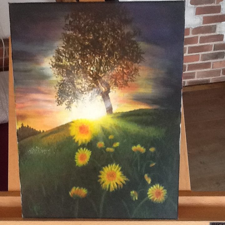 Ich finde es wirklich beeindruckend, wie du die Sonne gemalt hast. Wenn man das Bild anguckt, fühlt man sich vom Licht geblendet!