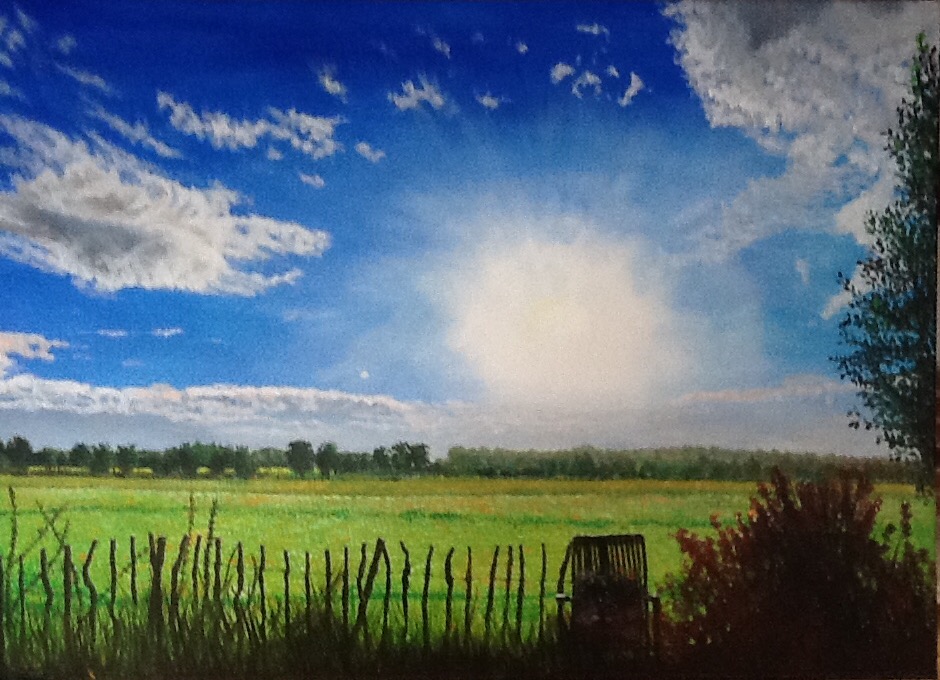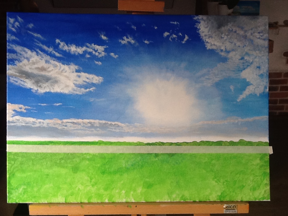 Hier ist ein Zwischenstand zu sehen. Nachdem der Himmel mit seiner Wolkenformation festgelegt war, habe ich mit einem Kreppband die Horizontlinie der Felder markiert: