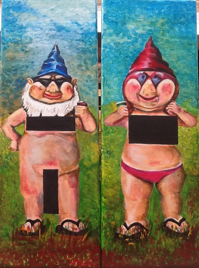 Ursprünglich Gärtnern oder mittelalterlichen Bergleuten nachempfunden avancierte der Gartenzwerg zur typisch deutschen Gartendekoration und überlebte mit all dem Stolz seiner Besitzer nicht nur den ersten, sondern auch den zweiten Weltkrieg. Danach erfuhr er eine moderne „Wiedergeburt“ durch die Schaffung neuer, provokativer Modelle. Nun wurden beispielsweise Zwerge mit Messer im Rücken, als Exhibitionisten, einen „Vogel“ zeigend, mit Motorsäge, mit erhobenem Stinkefinger oder gar als Politiker modelliert. Inzwischen halten sie uns unseren eigenen Spiegel vor und lachen sich dabei kaputt. Mit den beiden vorliegenden Zwergen beginne ich eine Serie von drei Doppelzwergen, die ich im Laufe der Zeit vervollständigen werde.