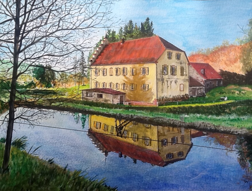Auf dem Weg zur Quelle des Trienzbachs kam ich bereits an ihr vorbei: der Forellenzucht Marienthal (Trienzbachidyll I). Sie aus der Perspektive des Rückwegs zu malen war gar nicht so einfach, weil sie ein kompliziertes Objekt darstellt.
