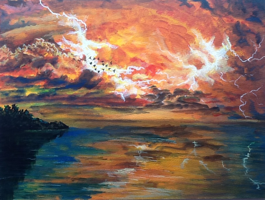 Es gibt Motive, die mir die Möglichkeit geben, meine augenblickliche Stimmung sichtbar zu machen. Ein Energie-entladendes Gewitter gehört dazu. Ich habe es gemalt, nachdem die Presse ausführlich von einem Gespräch berichtet hat, um auf diese Weise zu verhindern, dass diesem Gespräch eine Plattform gegeben wird. Nachdem dadurch der Welt das viel bekicherte Gespräch zwischen Frau Seidel (ooops, da könnte ich mich verschrieben haben) und Herrn Muskel (da auch) zugetragen wurde, hat sie staunend erfahren, dass Adolf Hittler (da schon wieder) kein Nazionalsozialist, sondern Kommunist war. Ich kann mir gut vorstellen, wie die Angelegenheit mit diesem Geschichtsrevisionismus weitergeht. Demnächst postet Herr Muskel auf seiner X-beliebigen Wahrheitsmachine: „Hatte ein angenehmens Gespräch mit A**. Sie hat mir im Nachhinein mitgeteilt, dass sie zum Kommunismus konvertiert ist und seitdem intensiv überlegt, wie sie die leider und zu Unrecht in Verruf geratene Farbe Braun durch ihr strahlendes Blau ersetzen kann [Kicher-Smiley][Kicher-Smiley].“ Dann wird Herr Muskel grinsen und hinzufügen: „Liebe A**, solltest du dafür etwas Geld benötigen [Kicher-Smiley], gib mir Bescheid. Ich bin in solchen Dingen nicht kleinlich [Lach-Smiley][Brüll-Smiley].“