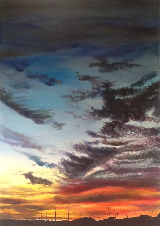 Ich habe inzwischen schon viele Himmel gemalt, aber dieser hier ist anders. Er unterliegt Turbulenzen, wie wir sie in Europa möglicherweise nicht kennen. Jedenfalls habe ich einen solchen Himmel bisher noch nicht beobachtet.