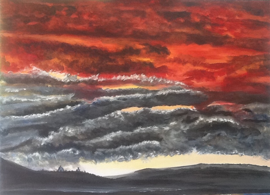 Dies ist ein bizarrer und ungewohnter Himmel. Er kommt vor, wenn die Farben des Sonnenuntergangs ähnlich wie bei einem Regenbogen getrennt werden. Wir sehen das Gelb des frühen Sonnenuntergangs und das feurige Rot des Sonnenglühens deshalb gleichzeitig, räumlich aber getrennt. Dazwischen eine Furcht einflößende Gewitterfront. Da ist alles beieinander…