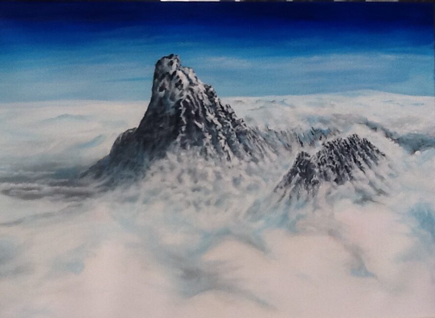 Mein Kontext zu diesem Bild ist ein anderer. Ich befinde mich als Betrachter zwar auch über den Woken, nicht aber im schützenden Concon des Flugzeugrumpfs. Ich spüre deshalb die Natur mit all ihren Widrigkeiten der Höhe: es ist bitterkalt und es weht ein heftiger, eisiger Wind. Ich friere fast beim Malen, obwohl ich mich in eine warme Ecke verkrochen habe. Ich bin froh, dass ich das kann, denn draußen ist es eisig kalt und der Schnee liegt bereits seit einigen Tagen.