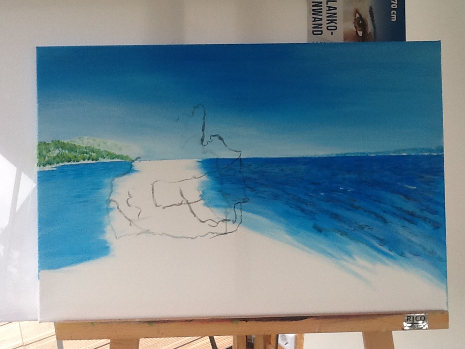 Der Hintergrund und sein Horizont sind erst einmal abgeschlossen. Erste Wellenverläufe sind angedeutet. Jetzt kann die Steininsel platziert werden. Dazu zeichne ich ihren groben Verlauf mit einem Pinsel und unverbindlicher Farbe an: